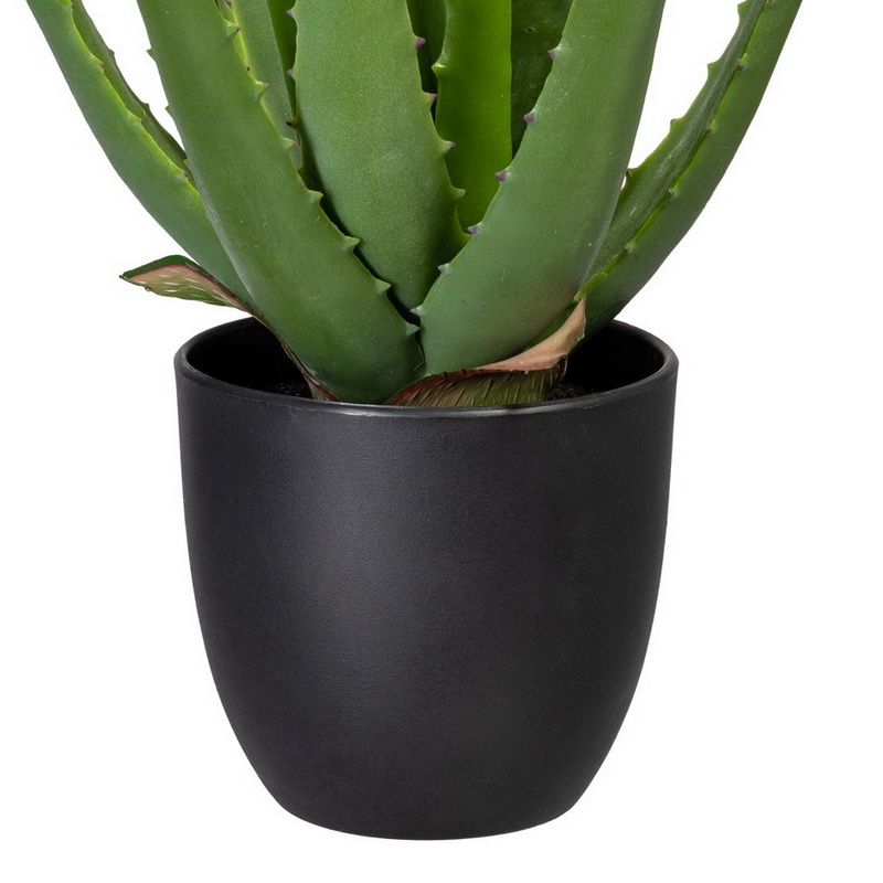 Umelý kaktus Aloe má celkom 13 listov a je vysoký 33cm vrátane dekoratívneho plastového kvetináča. Kvetina má do detailu prepracované listy kaktusu. Celá kvetina je vložená do kvetináča 11x10,5 cm.