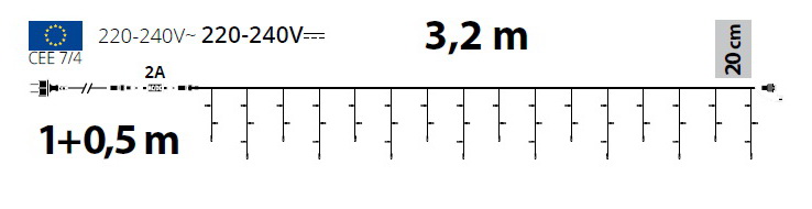 Ľad kvapľník zo série PROFI na 230V pre vonkajšie aj vnútorné použitie je dlhý 3,2m, vysoký max 0,4m. Celkom 56 kvalitných SUPER LED ø10mm so supersvietivosťou 18lm. LED cencúľ je možné prepojiť na max 20ks na dĺžku max 64m na jedno napájanie. Napájací kábel 1,5m je súčasťou balenia. Farba nosného kábla je biela, režim svietenia je stále svietiaci.