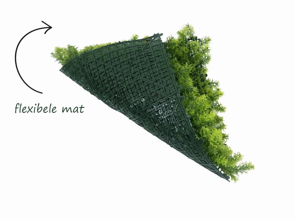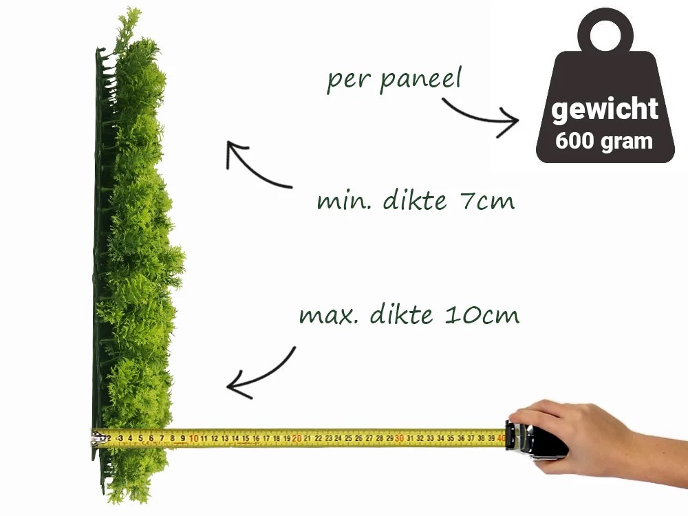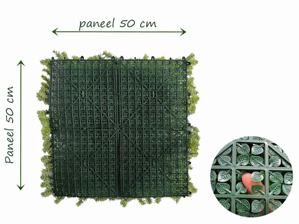 Umelý živý s načechraným motívom a veľkou hustotou je najvyššou radou umelých plotov v exklusívnej kvalite s nejrealistickejším dizajnom. Dá sa napojiť bez viditeľných spojov. Diel je v rozmere 50x50cm. Dílce možno jednoducho upraviť nůžkami, alebo štípačkami na požadované rozmery. Dílce sa spájajú pomocou integrovaných otvorov a príchytkov, možno tak vytvoriť nekonečne veľký na seba navazujúcu plochu živého plotu. Nosná kostra je tvorená plastovými dielmi cca 24x24cm s jemným rastrovaním, ktoré sú už z výroby spojené do rozmerov cca 50x50cm. Veľmi jednoduchá inštalácia. Zoznam materiálov: hlavne PE. Dekorativní časť plotu tvorí hustá skupina veľmi realistických zoznamov umiestnených na zelenom rastre. Lístky majú rôznu veľkosť a rôzne odstíny zelené Velice zdařilá imitácia živého plotu. Rozloženie listov je pohľadovo jednostranné.