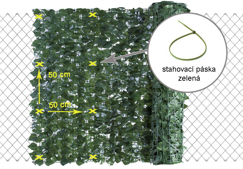 Umelý živý plot s listami VAVŘÍN PREMIUM je dodávaný v rolke s výškou 1,5m a šírkou 2,4m. Prémiová kvalita listov. Celková plocha je 3,6 m2. Tento živý plot sa dodáva iba po celých roliach. Úlohu je možné upraviť nožnicami, alebo štiepačkami na požadovaný rozmer po násobkoch 5,5 cm. Veľmi jednoduchá inštalácia. Nosnú kostru tvorí plastový PE raster s okami cca 5,5 x 5,5 cm. Materiál listov: PE. Dekoratívnu časť plotu tvoria skupiny listov trojprstého dlanitého tvaru a brečtanu, vpletené do plastového rastra. Listy imitujú skutočnú rastlinu používanú na živé ploty, konkrétne sa jedná o brečtan. Listy majú niekoľko veľkostí a odtieňov zelenej pre realistický vzhľad. Rozloženie listov je pohľadovo jednostranné. Vyrába sa tiež vo variante 1m x 2,4 m.Odporúčaný počet montážneho materiálu na jednu rolu je 40 kusov.